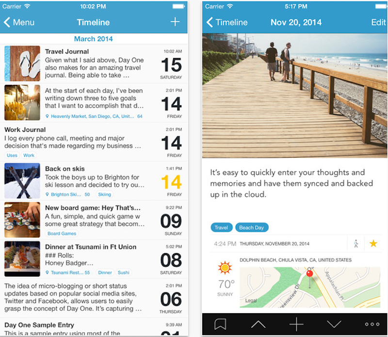 Day One – за да запомните всеки детайл от совето пътуване! Своеобразен дневник, в който можете да видите всичко за своето пътуване за миг – от местоположението и метеорологичните условия, до песента, която сте слушали. Приложението изпраща всекидневни напомняния, като дава възможност да публикувате спомените си във Facebook или да ги запазите за себе си.