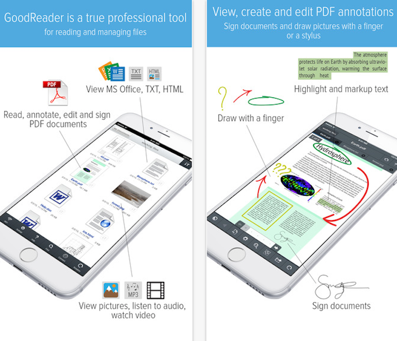 Good Reader – работете с разнообразни файлове, лесно и удобно! Приложението ви дава достъп до всякакви видове файлове – отваряне, четене, редактиране, от Microsoft Word до PDF. Можете да добавяте скици и бележки и да маркирате части от текста, след което да съхраните документа в Dropbox, Google Drive или на друг сървър.
