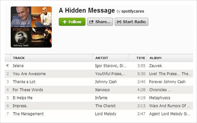 Вчера, запален потребител на музикалната услуга Spotify пратил интересно предложение за нова функция. Човекът от поддръжката, видимо впечатлен и благодарен за страхотната идея, създал специален плейлист за Йелена Воер, в който заглавията на парчетата изписват посланието: „Йелена / Ти си страхотна / Много благодаря / За тези думи / Това ще ми помогне / Да впечатля ръководството.“ Мило, креативно и изненадващо.