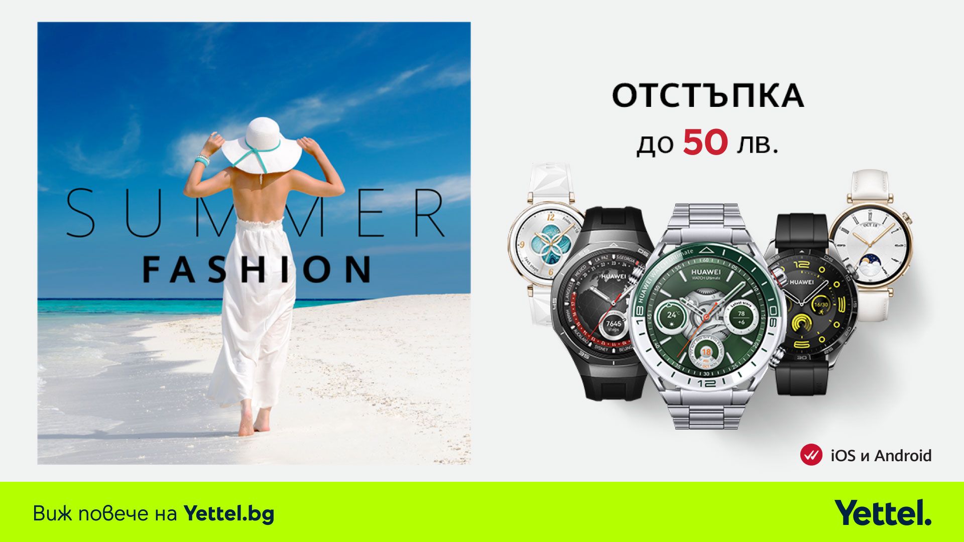 До края на месец юни Yettel предлага специална лятна селекция от смартчасовници HUAWEI, които комбинират елегантност, здравни функции от ново поколение и издръжлива батерия. Някои от устройствата могат да бъдат закупени с отстъпка до 50 лв. – в брой или на лизинг, в цялата магазинна мрежа на оператора. А за всички онлайн поръчки е включена безплатна доставка.