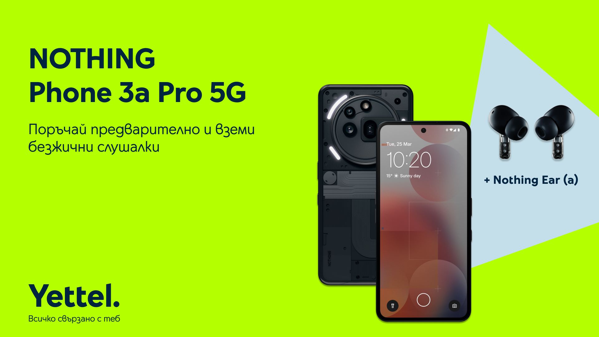 Yettel стартира предварителните поръчки за впечатляващия Nothing Phone (3a) Pro – модел, който приковава погледите с отличителния си дизайн и камера с отлични характеристики за своя клас. Клиентите, които направят поръчка до 23:59 ч. на 25 март, имат шанс да получат устройството в комплект със слушалките Nothing Ear (a) до изчерпване на количествата, като заявените устройства ще бъдат доставени преди официалния старт на продажбите. Смартфонът се предлага в елегантен сив и класически черен цвят, а цената му с двугодишен договор с план Total Unlimited MAX е 549.99 лв. при покупка в брой или 26.99 лв. на месец на лизинг.
