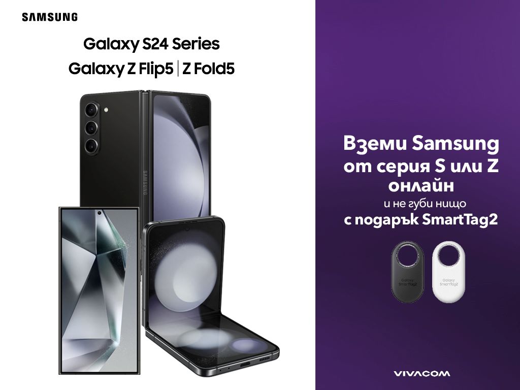 До края на април всеки потребител, закупил смартфон Samsung от сериите S или Z от онлайн магазина на Vivacom, ще получи подарък SmartTag2. В специалното предложение са включени флагманите на Samsung, сред които Samsung Galaxy S24 Ultra и сгъваемите Samsung Galaxy Z Flip5 и Galaxy Z Fold5. И трите смартфона работят с интегриран Galaxy AI, който позволява превод в реално време, усъвършенствани функции за търсене с Circle to Search и още по-лесно редактиране на снимките с функцията Edit Suggestion.