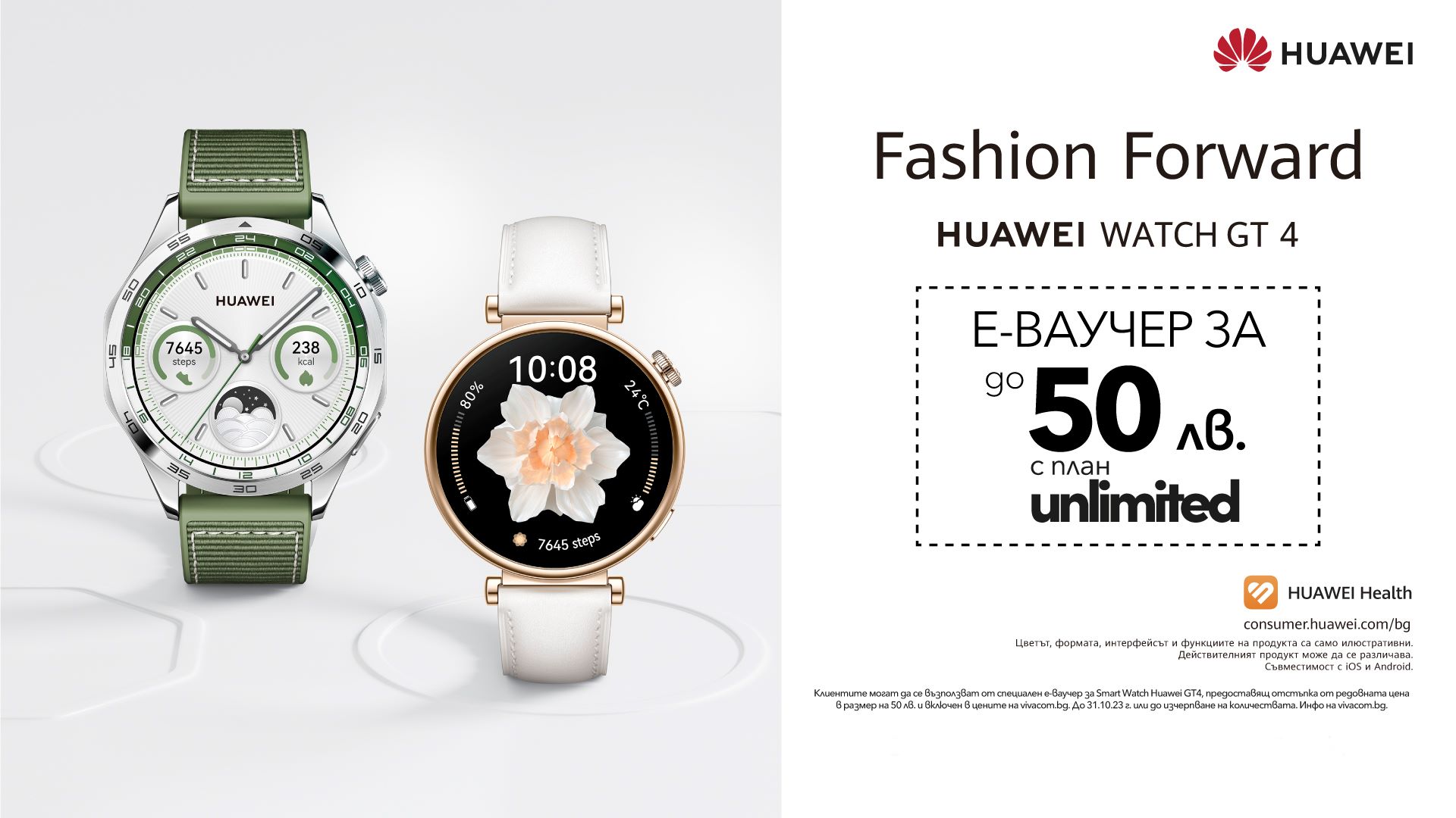Най-новата серия смарт часовници на марката Huawei – Watch GT 4, вече може да бъде намерена във всички магазини на Vivacom или онлайн на специалните цени от 9.98 лв. на месец на лизинг за 24 месеца със сключване на 24-месечен договор с план Unlimited 300. Освен това, клиентите ще имат възможността да се възползват и от специален е-ваучер, който ще им предостави отстъпка от редовната цена на смарт часовниците Huawei Watch GT 4 в размер на 50 лв., включително в цените на vivacom.bg. Офертата ще продължи до 31 октомври 2023 г. или до изчерпване на количествата.
