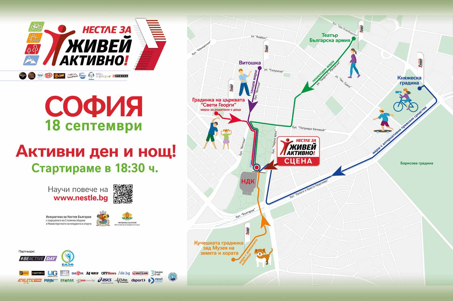 В първото вечерно издание на инициативата под мотото „Активни ден и нощ“ освен звезди ще се включат и над 80 спортни и танцувални клуба, които ще предизвикат столичани да се движат и забавляват от 18 часа до полунощ на 18 септември