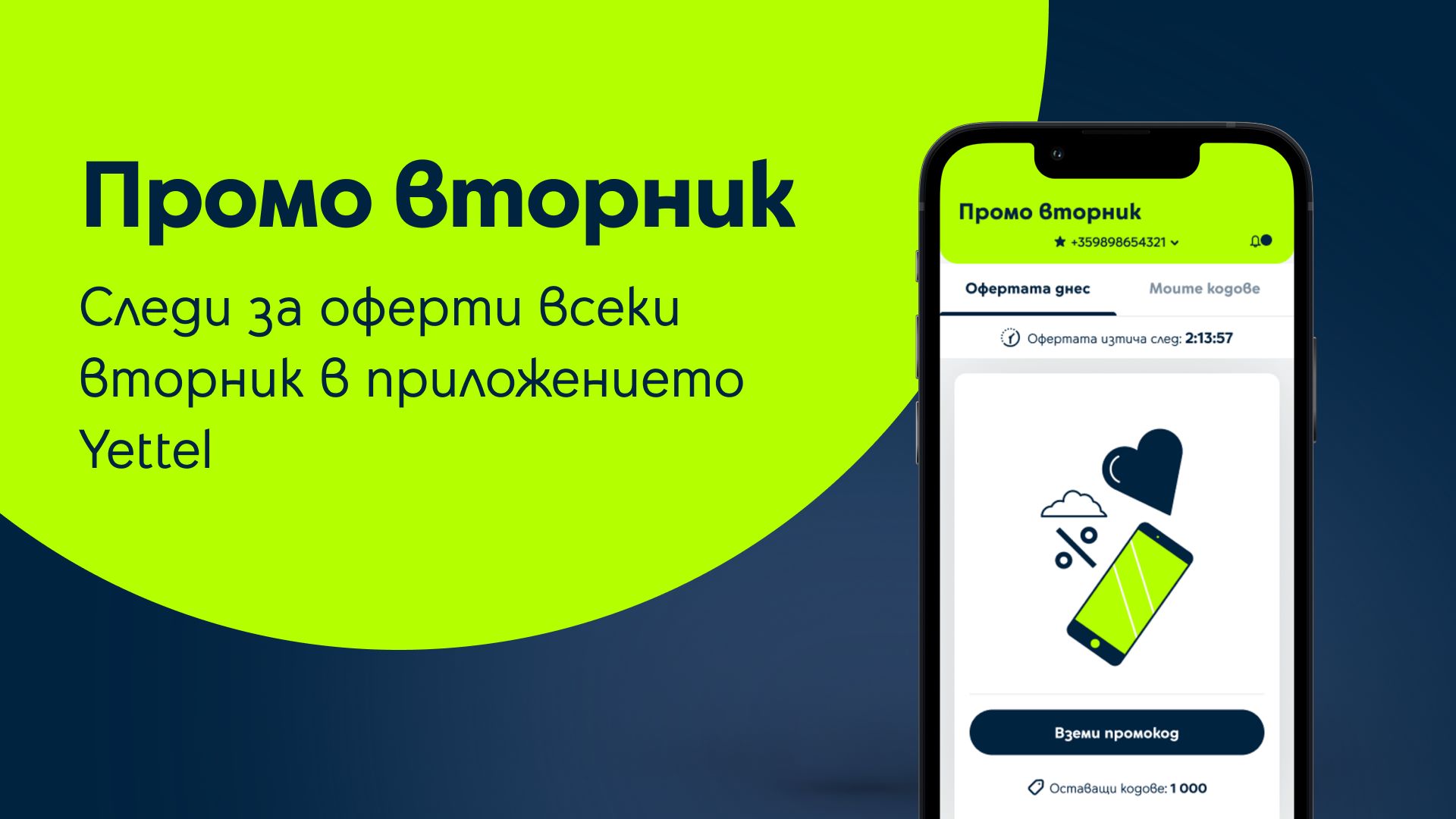 С новата седмична инициатива „Промо вторник“ Yettel продължава да надгражда дигиталното клиентско изживяване в мобилното си приложение – най-високо оценената телеком апликация в България. Така клиентите на оператора вече разполагат с две възможности за достъп до специални отстъпки в мобилното приложение. Играта „Петък с Yettel“, любима на много потребители, всеки петък дава шанс за спечелване на промокодове за отстъпки в партньорски обекти като Fashion Days, Biotrade Cosmeceuticals, Cocosolis, Ozone.bg и други. В същото време, новата инициатива „Промо вторник“ за първи път предоставя преференциални оферти за покупка на устройства, предлагани от Yettel.