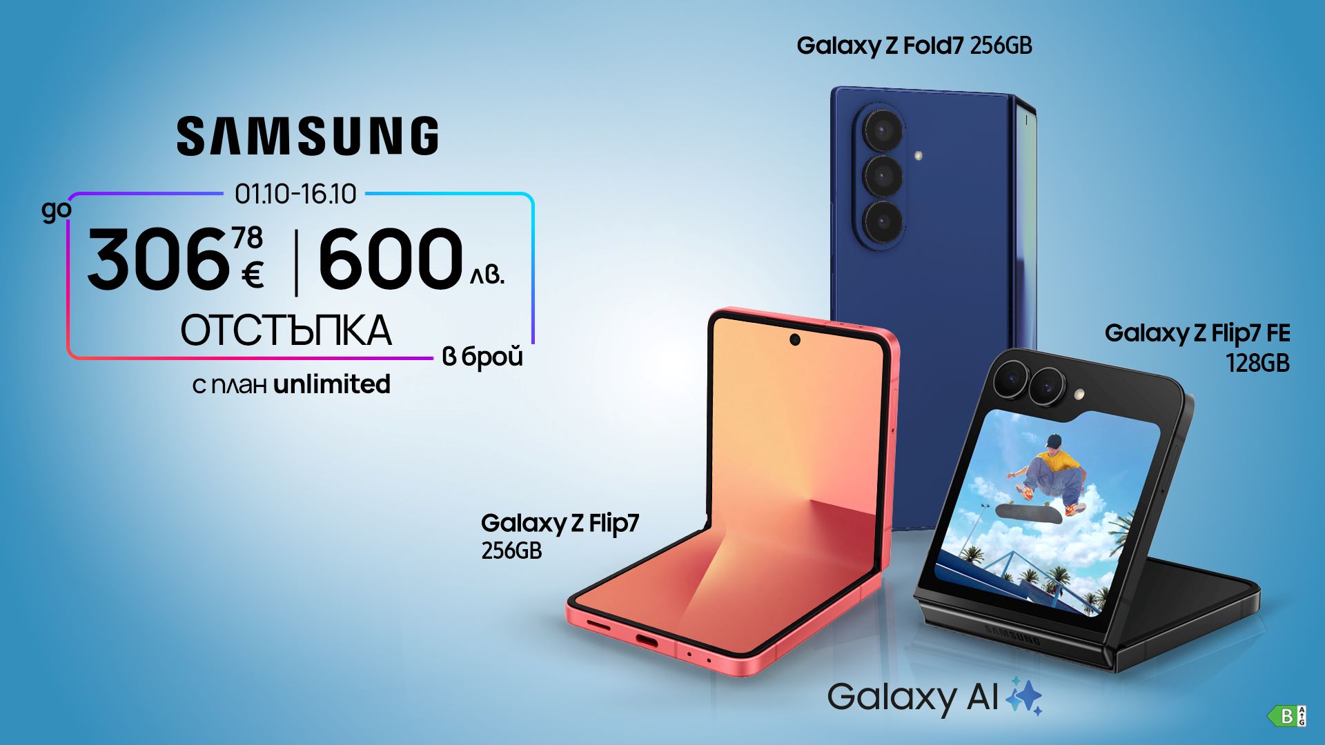 Vivacom започва месец октомври с ексклузивна онлайн промоция на най-новата серия сгъваеми смартфони Samsung Galaxy Z Fold7, Z Flip7 и Z Flip7 FE. До 16 октомври 2025 г., клиентите могат да закупят избран модел от серията 5G смартфони с отстъпка до 306.78 € | 600 лв. при сключване на 24-месечен договор за план Unlimited.