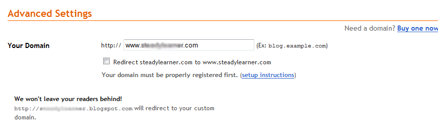 От менюто за настройка на домейна, предоставено от сайта, където сте го закупили, изберете функцията Forward (пренасочване, англ.) и пренасочете domain.com към domain.blogspot.com, който пък ще пренасочи автоматично към www.domain.com. Знам, че звучи сложно, но работи перфектно и блогът ви е зареждаем както със, така и без www.