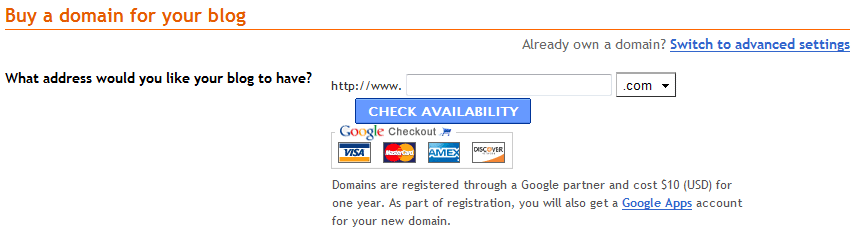 Най-удобният вариант е да го направите директно от вашия Blogger профил, използвайки услугите на Google. Ще ви е нужна кредитна или дебитна карта. Менюто е достъпно от Settings > Publishing.