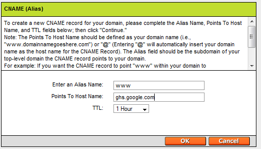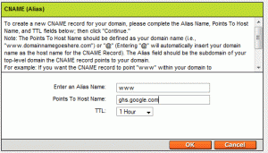 Ако желаете www.domain.com, в CNAME полето въведете единствено www и го насочете към адрес ghs.google.com.