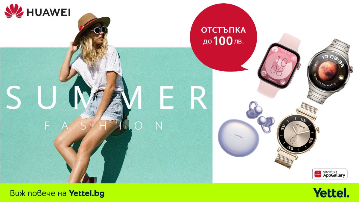 В кампанията HUAWEI Summer Fashion са включени още разнообразни модели, сред които HUAWEI Watch Fit 3 на цена от 279,99 лв. или на лизинг за 12,99 лв./месец, HUAWEI Watch GT 4 46mm Green за 449,99 лв. или на лизинг за 20,99 лв./месец, и HUAWEI Watch 4 Pro LTE с кожена каишка за 849,99 лв. или на лизинг за 36,99 лв./месец. За пълния списък и подробности посетете сайта на Yettel.