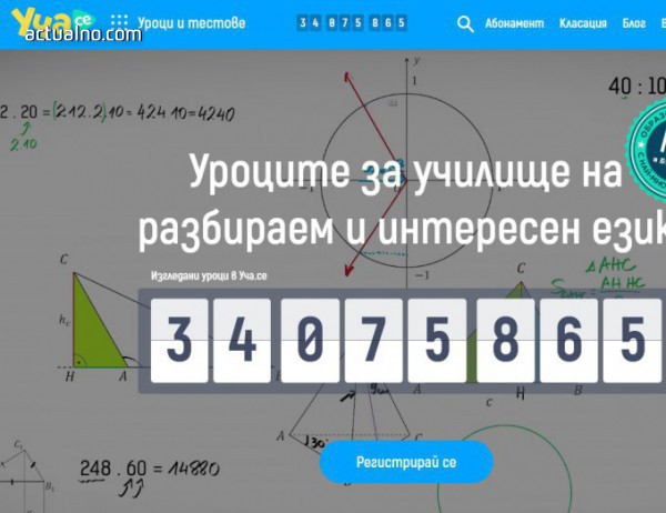 Уча.се е онлайн платформа с всички видео уроците за училище на разбираем и интересен език. Със своите над 12 000 видео урока и упражнения, сайтът помага на всички ученици от 1-ви до 12-ти клас да повишат успеха си, да се забавляват и да имат повече свободно време. След видео уроците ученикът може да тества наученото с тестове и ако някъде отговори неточно, Уча.се автоматично предлага точния откъс от урока, за да навакса пропуска.