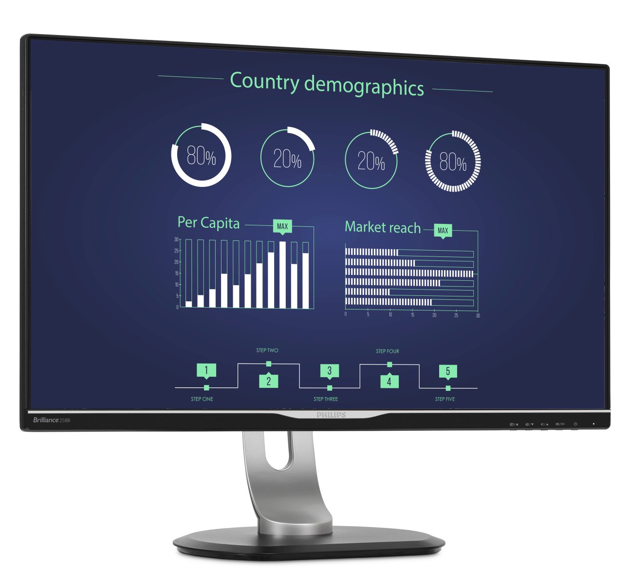 Philips 258B6QUEB е чудесен, универсален 25-инчов USB-C докинг монитор, който покрива нуждите на бизнес потребителите. Quad HD резолюцията гарантира остра и блестяща картина. В допълнение, стойката SmartErgoBase позволява на потребителите на накланят, завъртат и повдигат дисплея до оптималната за всеки позиция. Ултра тънките рамки на екрана допринасят за изчистения вид и увеличават зрителната площ като на позволяват на човека през екрана да се разсейва от корпуса.