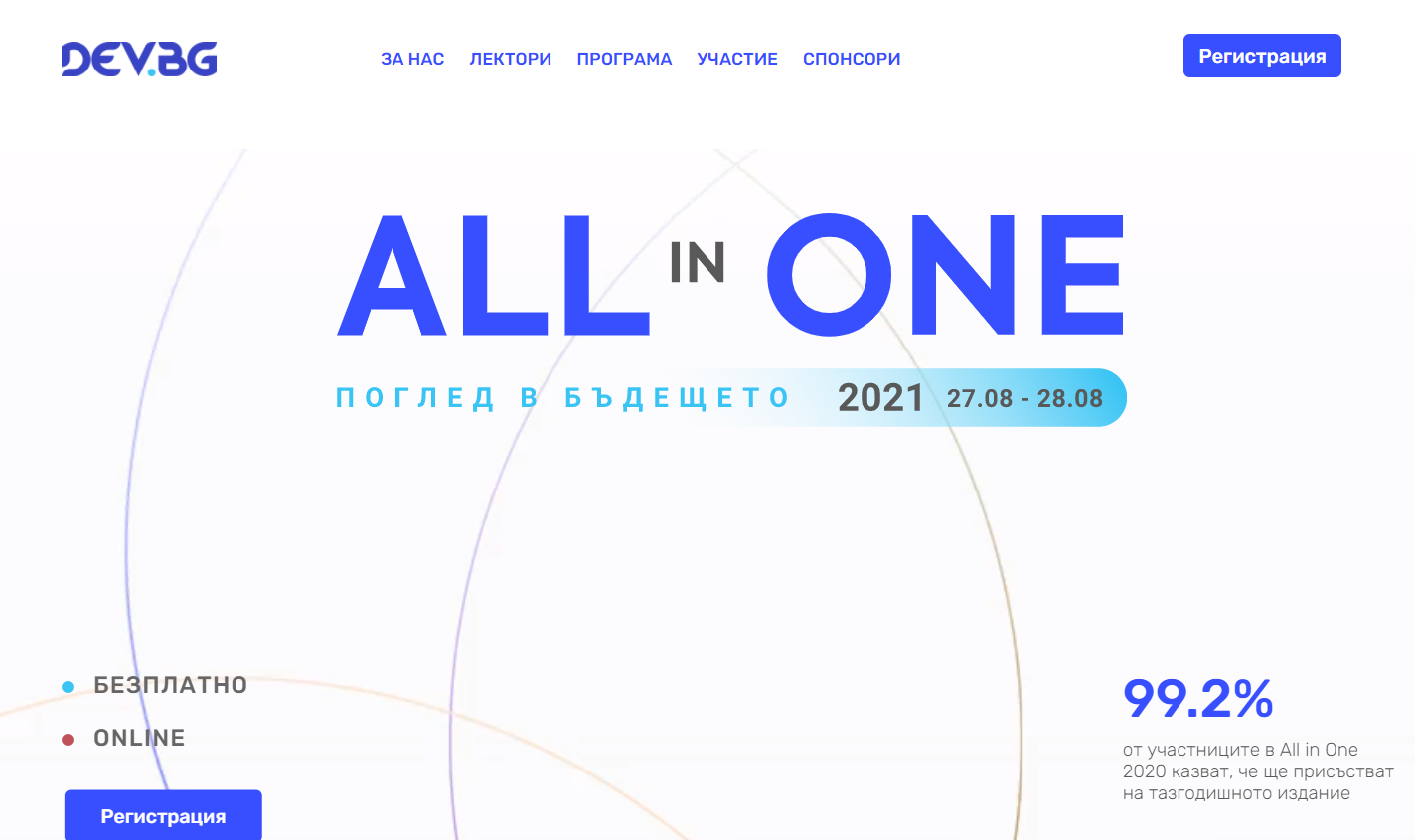 Кои технологии вече се развиват експоненциално, как те оказват влияние една на друга и до какви обществени промени ще доведе развитието им – върху тези въпроси ще се фокусира ИТ конференцията „All In One – поглед в бъдещето“, който ще се проведе онлайн у нас на 27 и 28 август. Събитието е свободно достъпно и се организира от платформата за ИТ обяви DEV.BG. Това е петото издание на форума, като през тази година той отново ще събере десетки лектори от България и чужбина. Разликата е, че издание 2021 ще бъде посветено в много по-голяма степен на бъдещето на технологиите и начина, по който те тепърва ще влияят на цялото общество.