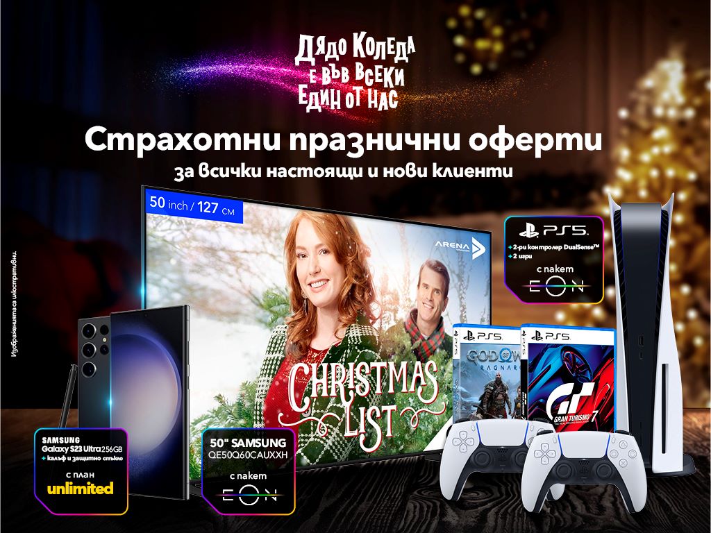 За любителите на коледните филми и видеоигрите Vivacom е приготвил атрактивни отстъпки на 50-инчов премиум смарт телевизор на Samsung и бюджетен 40-инчов модел на Hisense. За Коледа, изпълнена със забавление и прекрасни емоции, телекомът предлага намаление и на гейминг конзолата PlayStation 5, която може да бъде перфектния коледен подарък за всяко семейство. Освен че впечатляват с изгодните си лизингови цени, промоционалните устройства са в комбинация с пакета EON Premium и високоскоростен интернет за 1 лев на месец за първите до 4 месеца.