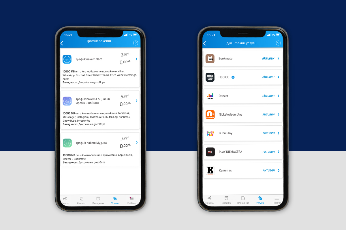 Вътрешните менюта също са с променен дизайн, който подпомага поинтуитивното избиране на конкретните услуги, като трафик пакети или дигитални услуги. Всяка услуга вече има своя икона, което прави ориентирането по-бързо и лесно за потребителите, като дигиталните услуги са със съответните си лога.