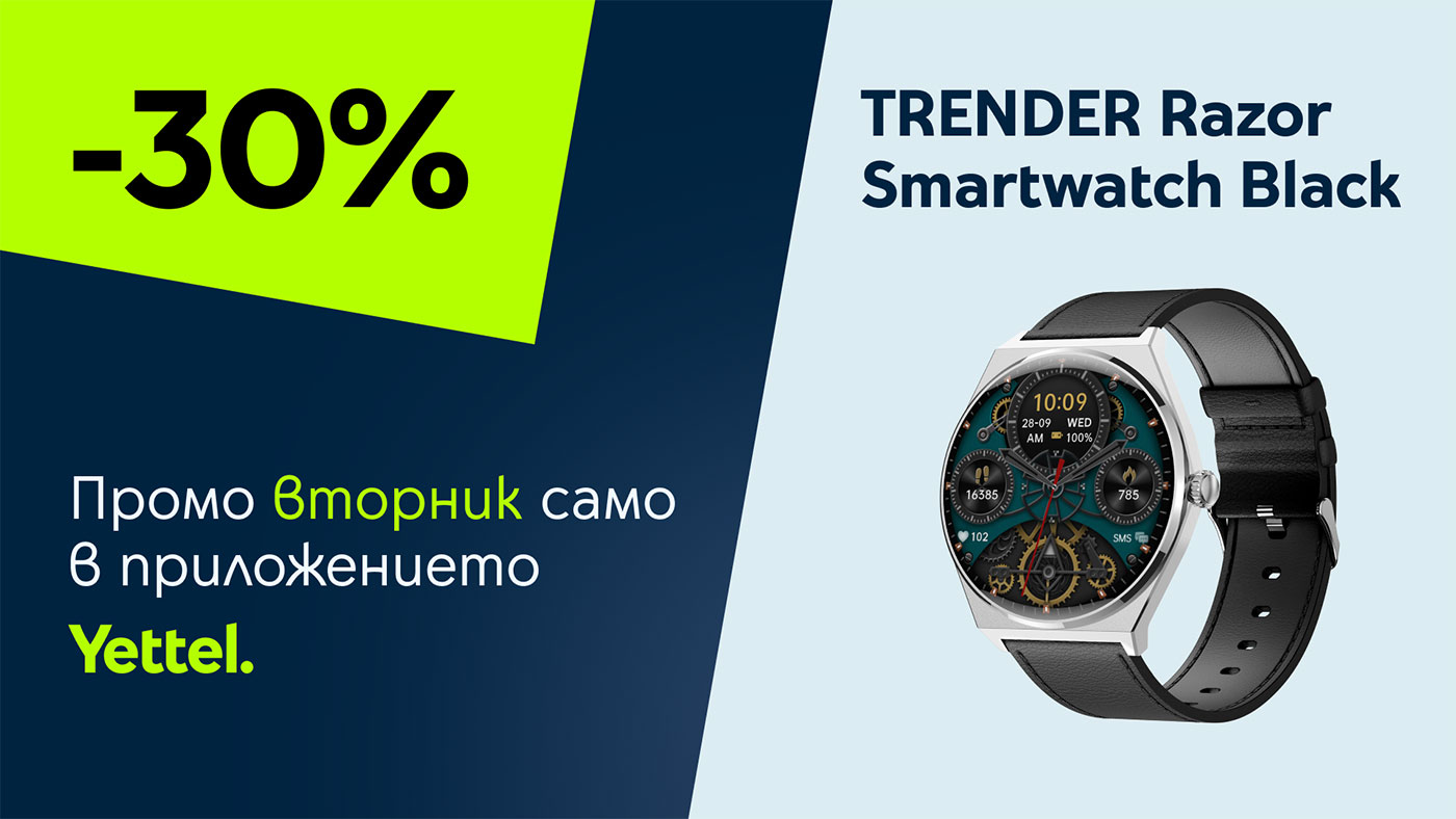 Само на 12 август клиентите на Yettel ще могат да се възползват от ексклузивна еднодневна оферта за смартчасовника TRENDER Razor Smartwatch Black – стилен и функционален модел с AMOLED дисплей и възможност за провеждане на Bluetooth разговори. Специалният промокод може да се вземе единствено в мобилното приложение на оператора до 23:59 ч. на 12 август и да се използва до края на следващия ден – 13 август. С него потребителите получават 30% отстъпка при покупка на устройството в брой през онлайн магазина на Yettel, без необходимост от подписване на договор. Часовникът се предлага в елегантен черен цвят, като доставката му е безплатна.