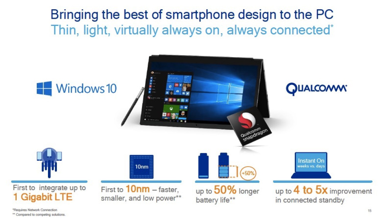Устройствата, базирани на Snapdragon, ще работят с пълна версия на Windows 10, оптимизирана за ARM и ще поддържат Office Sute, Cortana, Windows Hello и Windows lnk.