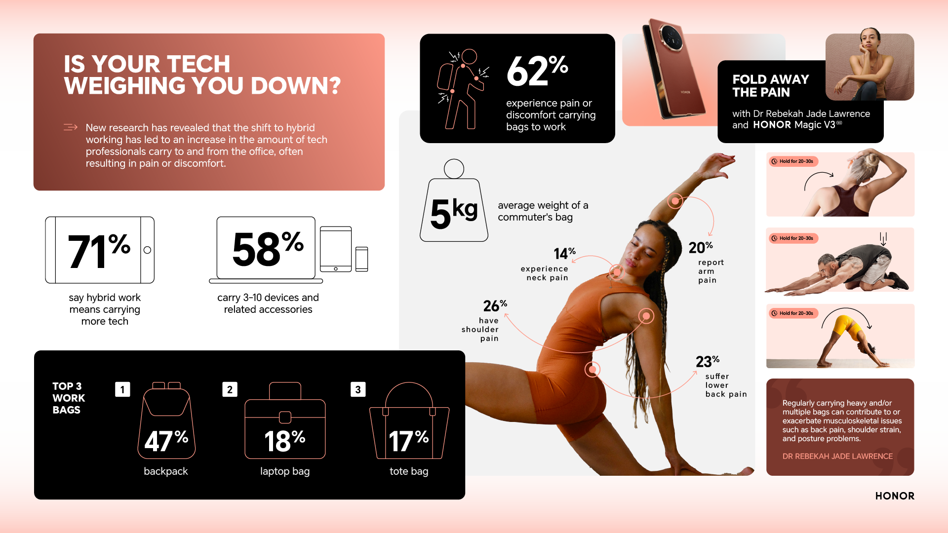 За пътуващите до и от работа, обременени от множество устройства, HONOR си сътрудничи с д-р Ребека Джейд Лорънс, за да препоръча чантите, които трябва да използват, и редовните упражнения, които могат да правят, за да облекчат болежките си.