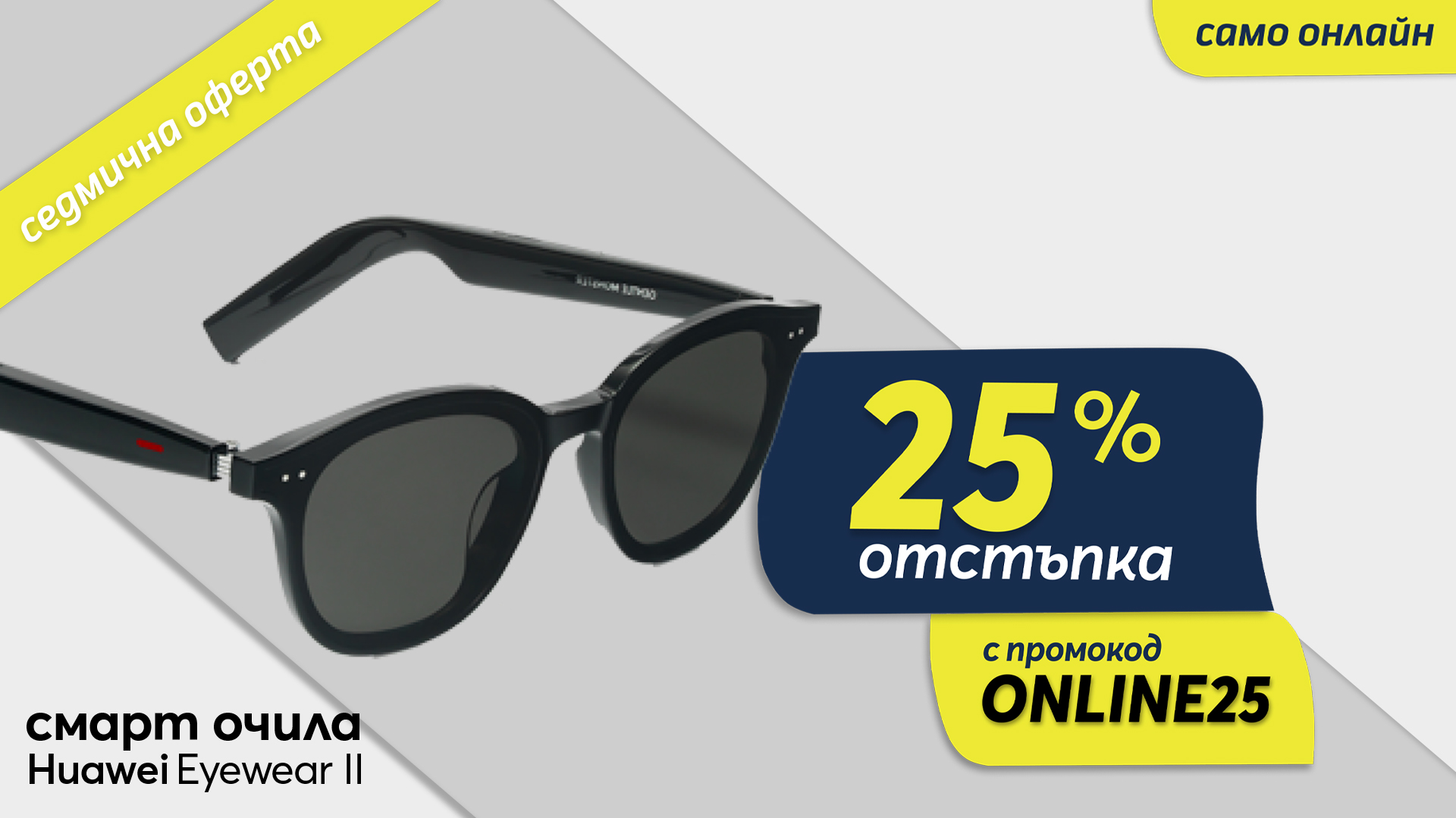 Тази седмица Теленор ще предложи на своите клиенти специална онлайн оферта при покупка на Huawei Eyewear II. От 17 до 24 май смарт устройството ще може да бъде закупено с 25% отстъпка. Офертата е валидна само при покупка в брой с промокод ONLINE25.