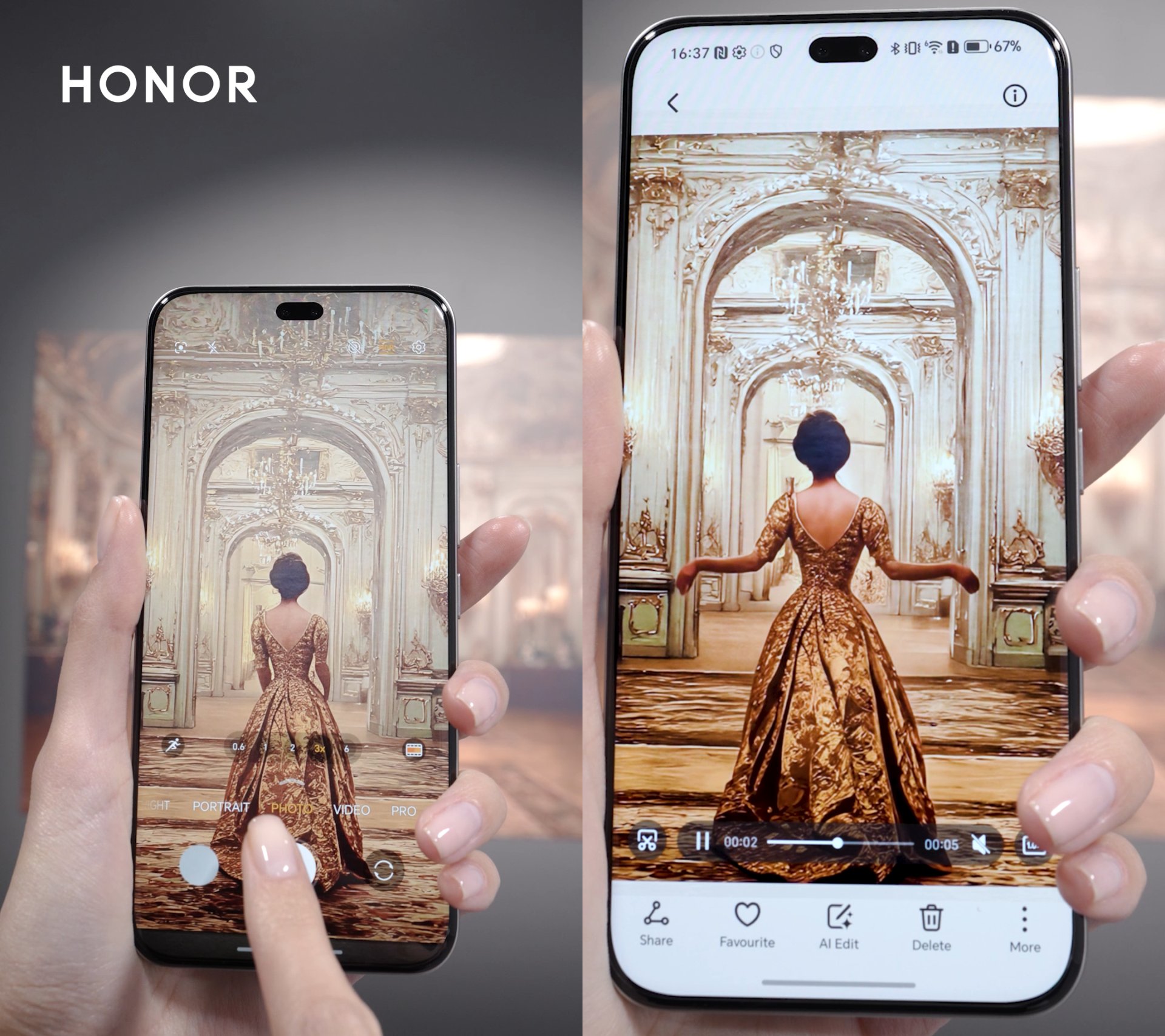 Фотографите често срещат значителни предизвикателства, когато опитват да заснемат шедьоврите, изложени зад защитно стъкло или осветени от прожектори в музеите. Отраженията, причинени от осветление, сенки или стъклени повърхности, могат да скрият важни детайли и намаляват цялостното качество на изображението. Серията HONOR 400 решава този проблем с функцията си AI Remove Reflection (Премахване на отражения с изкуствен интелект), която интелигентно открива и премахва отблясъците и така гарантира, че произведението на изкуството или обектът е заснет в най-чистата си форма.