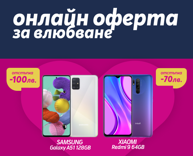 Само в онлайн магазина на оператора, до 1 март, могат да бъдат закупени на промоционална цена популярните Samsung Galaxy A51 128GB със 100 лв. отстъпка и XIAOMI Redmi 9 64GB със 70 лв. отстъпка във всички предлагани цветове. Отстъпката важи с всички тарифни планове и само при покупка в брой и се прилага автоматично при добавяне на продукта в „количката“.