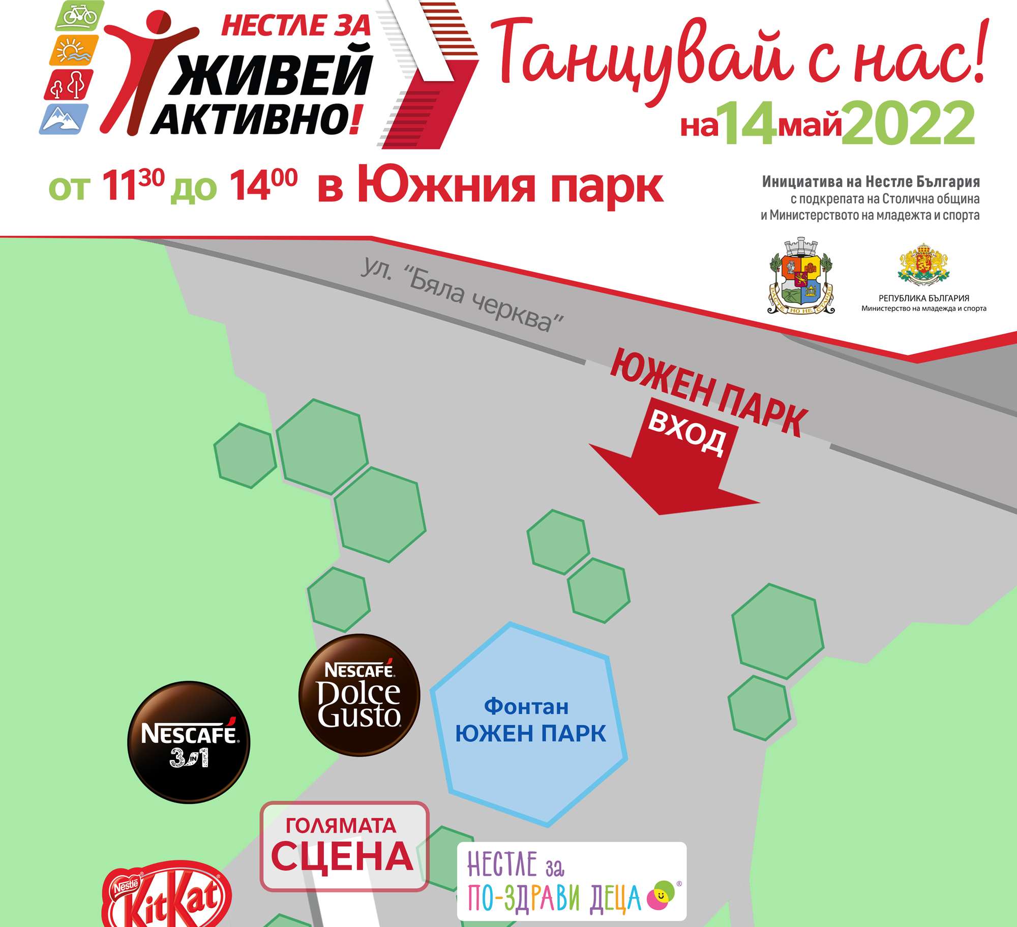Утре, 14 май, е стартът на своеобразния танцов маратон „Нестле за Живей активно! Танцувай с нас!“. Загрявката е от 10.00 ч. на пешеходната артерия на София – „Витошка“ и пресечката със „Солунска“ с треньор Алфредо Торес, а официалният старт е от 11.30 в Южния парк, на алеята до фонтаните.