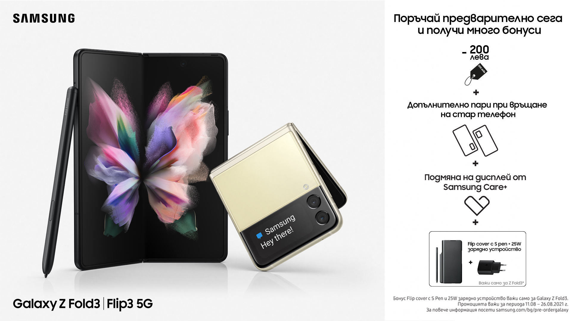 Теленор България обявява предварителните поръчки на двата ексклузивни модела на SAMSUNG – Galaxy Z Flip3 и Z Fold3. Те стартираха на 11.08 в 18:00 часа и продължават до 26.08 в 23:59 ч.