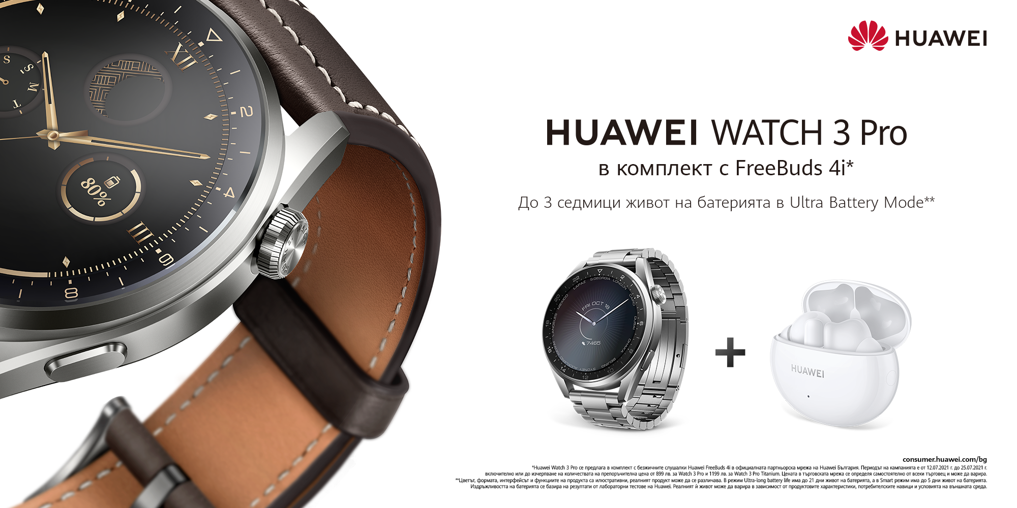 Теленор България предлага новите часовници от HUAWEI Watch 3 Series. Серията включва HUAWEI Watch 3 Pro 48mm с титаниева каишка, с кафява кожена каишка и HUAWEI Watch 3 46mm. HUAWEI Watch 3 Pro може да бъде закупен в комплект с безжични слушалки HUAWEI FreeBuds 4i от 12 юли до 25 юли. Офертата е валидна при плащане в брой или на лизинг.