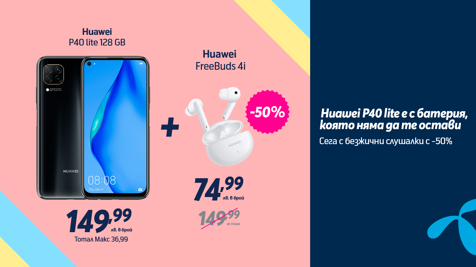 P40 lite може да бъде закупен с план Тотал Макс 36,99 в брой или на лизинг на цени от 149,99 лв. и 7,99 лв. респективно. Редовната цена в брой на слушалките HUAWEI FreeBuds 4i е 149.99 лв., като само сега те са с -50% от цената и могат да се закупят за 74.99лв.