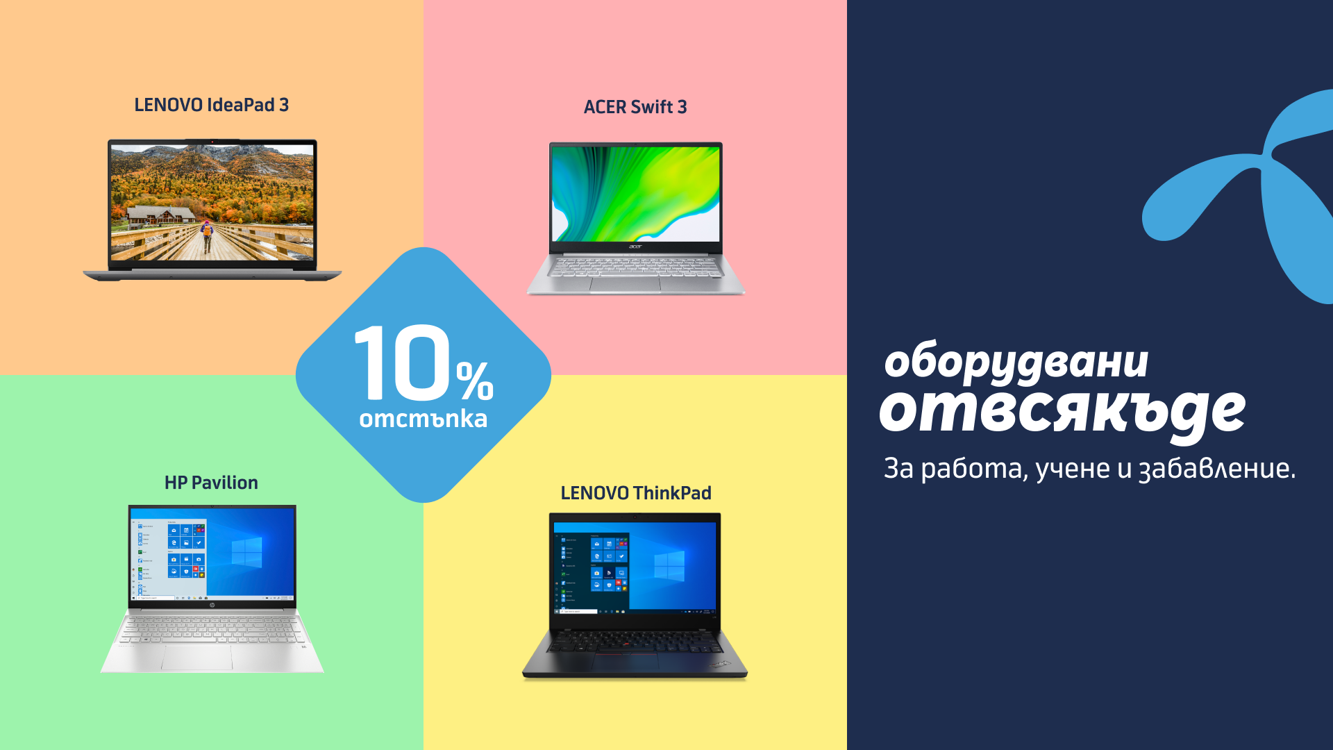 Теленор България предлага на клиентите си четири лаптопа с неустоима оферта от -10% от цената в брой или на лизинг в цялата търговска мрежа и онлайн до края на септември. ACER Swift 3 14 Silver, HP Pavilion 15.6 Silver, LENOVO IdeaPad 3 15.6 Grey и страхотният LENOVO ThinkPad L14 Black очакват потребителите в търговската мрежа на оператора.