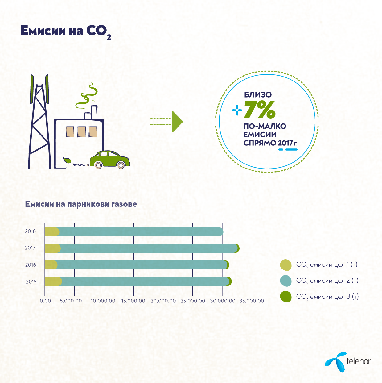 Към момента, 27 от базовите станции на Теленор са хибридни и при добри условия използват слънчева или вятърна енергия. През изминалата година потреблението на зелена енергия се е покачило с 13%, като по този начин значително са намалени и отделените парниковите газове и атмосферните замърсители. В същото време, през 2018 г. операторът отбелязва и значително намаление на потреблението на електричество, спестявайки близо 372 МВч, като бележи 14% спад на потреблението в офисите и 23% – в склада. Оптимизацията и постигането на висока ефективност при базовите станции пък води до минимално увеличение от 9% на използваната енергия от 2015 г. насам, при положение, че операторът реализира над 500% ръст в преноса на данни за същия период.