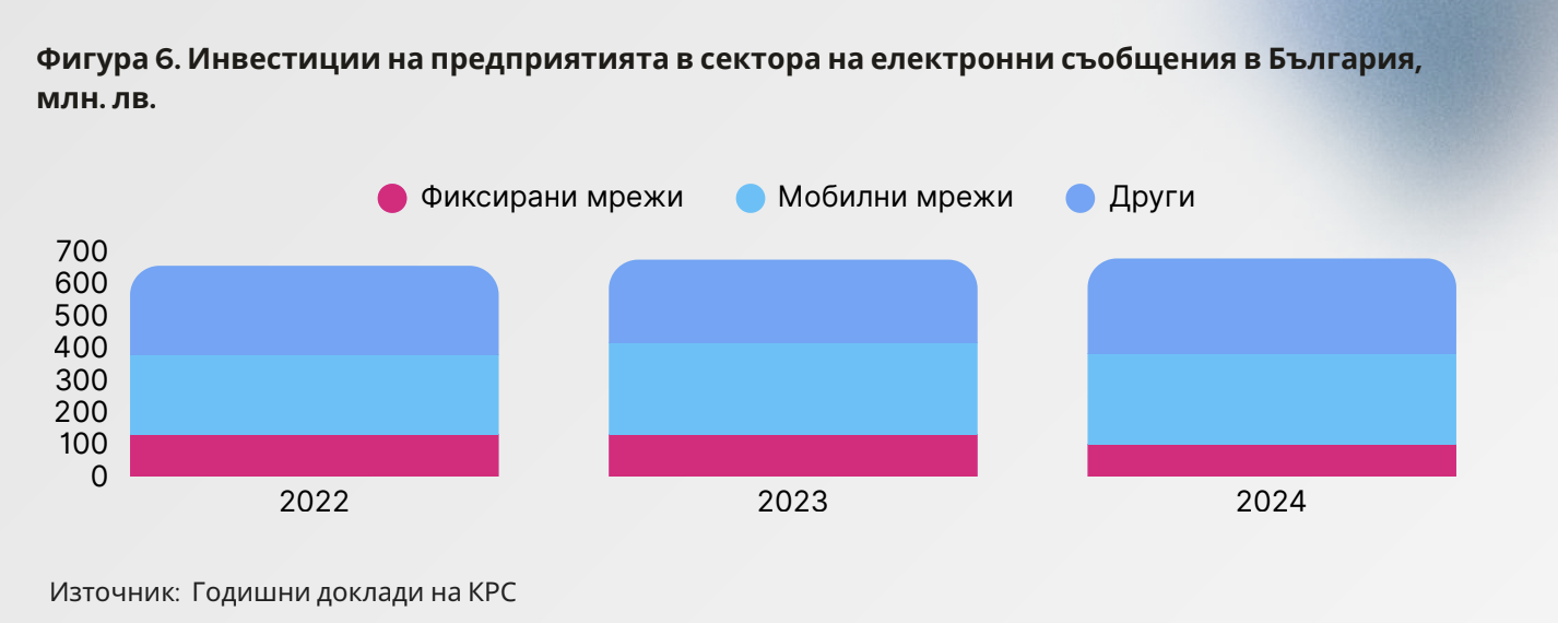 Телекомуникационният сектор е сред шампионите по инвестиции в България. През 2024 г. капиталовите вложения в изграждането и модернизацията на електронни съобщителни мрежи достигат 676 млн. лв., като инвестициите във фиксирани мрежи са 97 млн. лв. , а вложенията в мобилни мрежи – 284 млн. лв. Инвестициите на предприятията в сектора устойчиво надхвърлят 2% от общия обем капиталовложения в икономиката и достигат 2,3% през 2024 г. Ако се разглеждат само нефинансовите услуги, делът на телекомуникациите е 6,9% от всички инвестиции в страната.