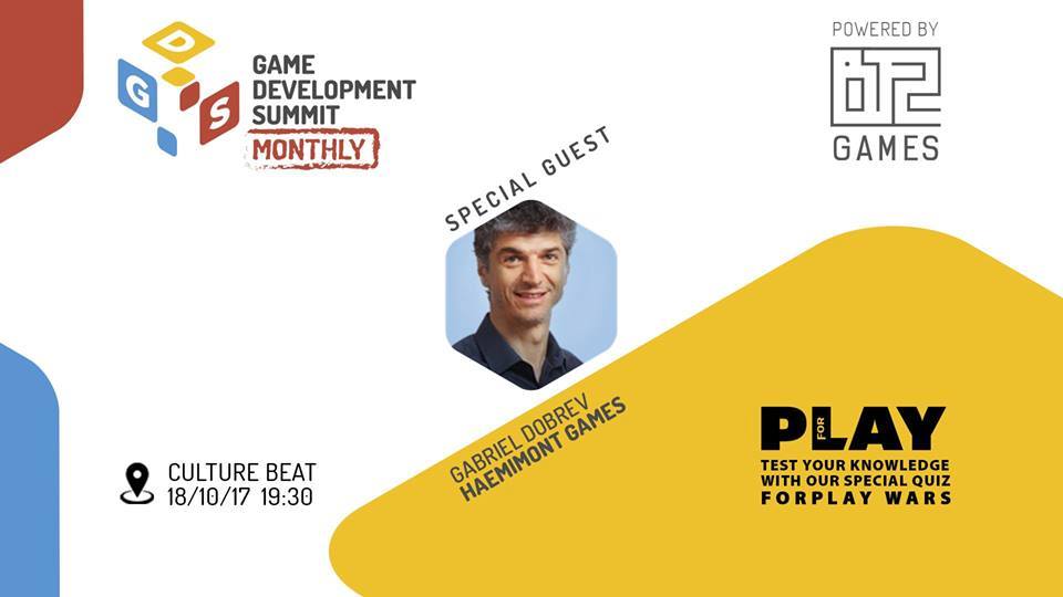 Конференцията за разработчици на видео игри – Game Dev Summit в партньорство с B12 Games, се завръща със серия от месечни събития, посветени на най-интересното от гейминг индустрията в България и по света. Първото събитие от серията Game Dev Summit Monthly ще се проведе на 18 октомври, 19:30 ч., в клуб „Culture Beat”. Програмата включва ексклузивно представяне на най-новата игра на студиото Haemimont Games и retro game куиз с водещи – момчетата от Forplay.bg.
