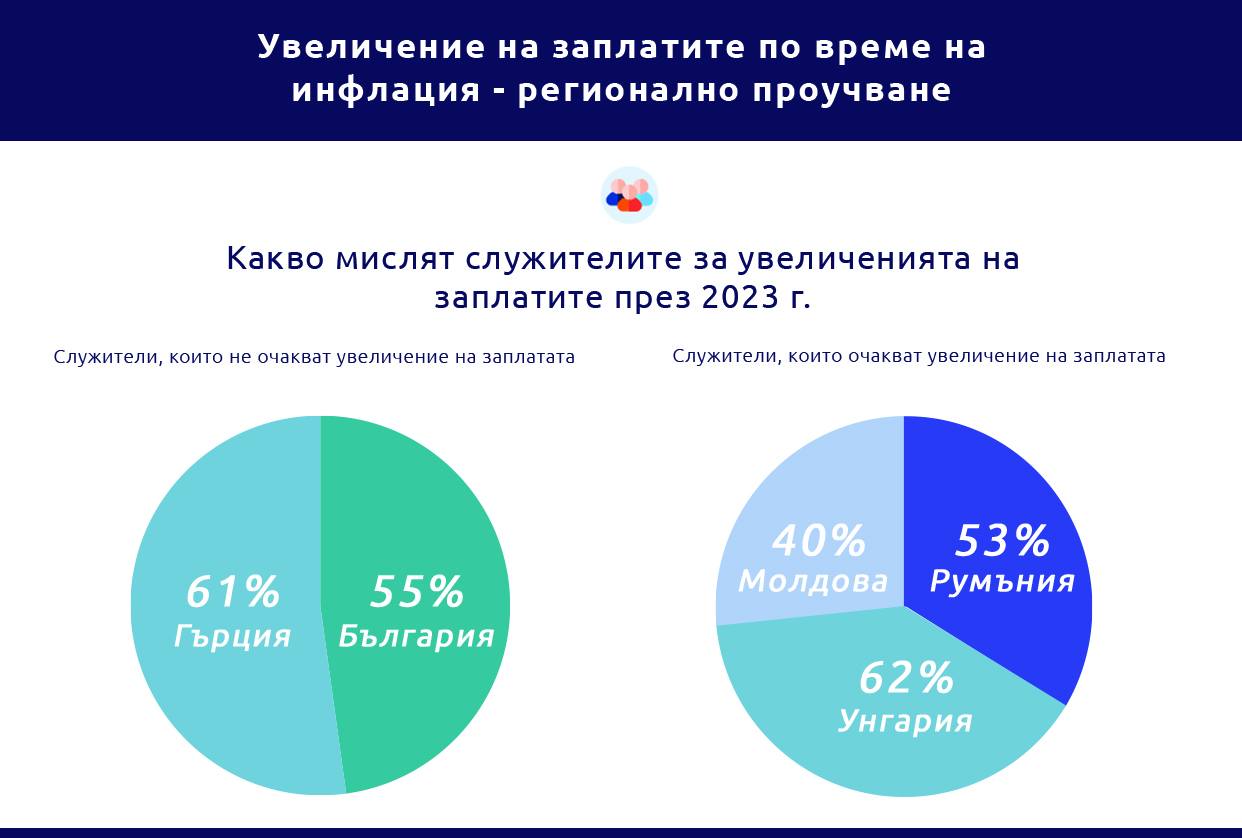 От 5-те участващи в проучването държави, България е страната с най-много служители, които получават увеличение на заплатите само ако заемат определени позиции (14%). Повечето работещи у нас (36%) посочват, че ще се справят много трудно с инфлацията, тъй като месечните им плащания и разходи вече обхващат голяма част от заплатата им. За сравнение 8,2% от румънците и 7,6% от молдовците заявяват, че биха се справили добре дори и да не получат увеличение на заплатите.