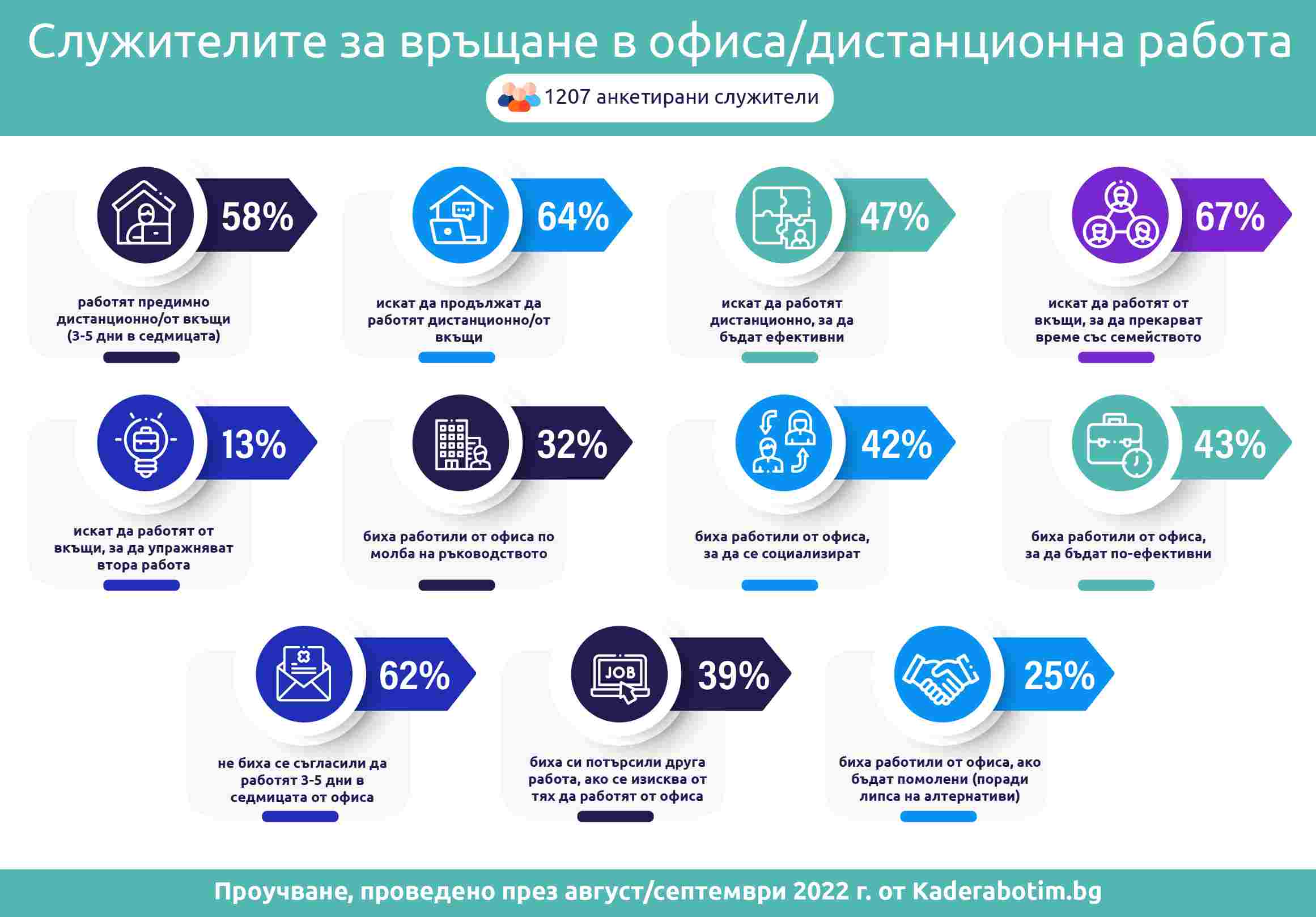 Допитването дава представа за актуалните тенденции по отношение на дистанционната работа у нас. Според него към момента 58,00% от българите работят предимно от вкъщи, а 42% – предимно от офиса. Резултатите показват още, че 39,35% от служителите биха си потърсили нова работа, ако работодателят им поиска да се върнат обратно в офиса. 34,13% биха разговаряли с останалите колеги и биха се опитали да убедят ръководството и отдела „Човешки ресурси“ да променят решението си, а 26,51% биха се върнали в офиса, защото нямат друг избор.