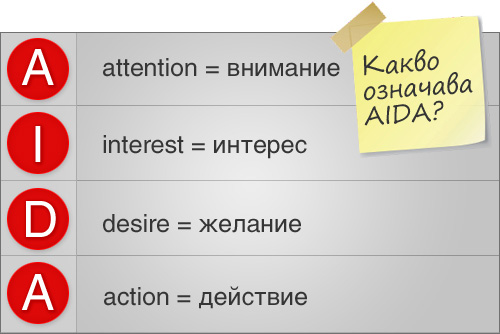 Аз на български му викам формулата ВИЖДА – внимание, интерес, желание, допълнителна информация, активност.