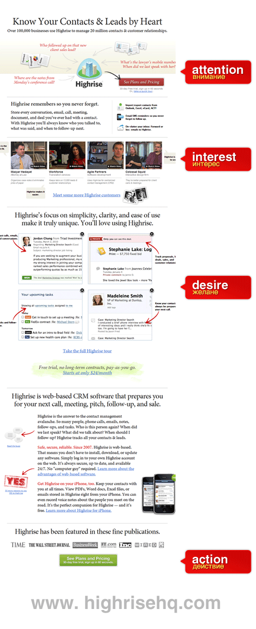 Компанията 37 Signals използва AIDA маркетинг модела за уебсайта на приложението Highrise.
