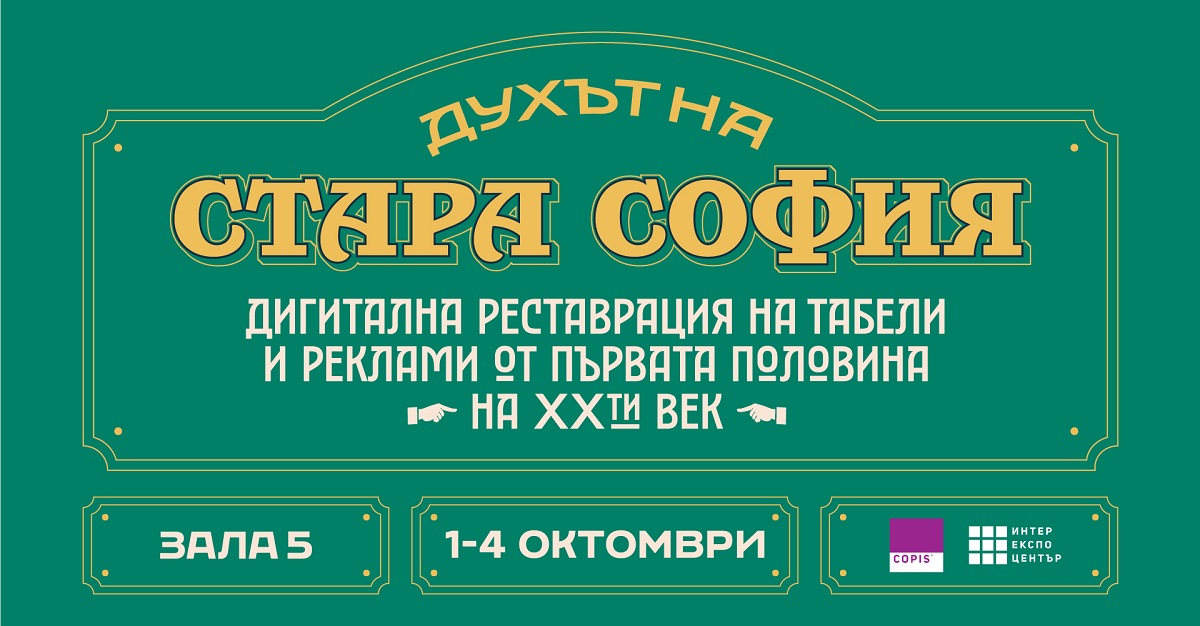 Духът на Стара София. Из българската столица, такава, каквато е била през първата половина на изминалия ХХ в., ще ни пренесе тази вдъхновяваща изложба. Реализирана от Лора Щиркова и Венцислав Джоков, тя представя уникалния проект на дигитално реставрирани табели и реклами от първата половина на ХХв.