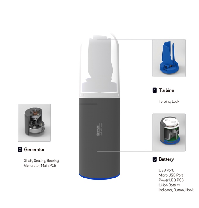 Estream е устройство с формата на куршум и дължина 24.6 см и диаметър около 6.3 см. В горната си част то разполага с малка перка с три крила, които могат да се прибират, когато не се използват. Когато бъдат потопени във водата, те се превръщат във витла и чрез въртенето си генерират енергия в малкия турбинен двигател, разположен във вътрешността. Тази енергия се съхранява в батерия, която също се намира в миниатюрното устройство.