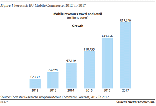 Разходите за покупки през мобилни устройства на гражданите на Западна Европа ще се увеличат до €19.2 милиарда до 2017, се твърди в проучване на Forrester.