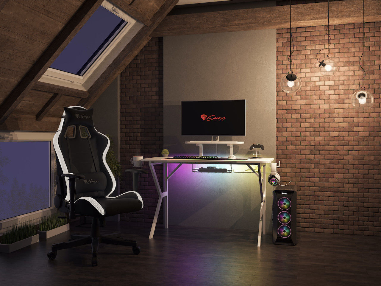 Игралното бюро Genesis HOLM 320 RGB White е перфектна възможност за потребители, които търсят комбинация от стил и функционалност. Неговият плот с размери 120 x 60 см е изработен от MDF плоскост, покрита с карбонов фурнир, а пространството е организирано по начин, който позволява оптимална използваемост на цялата площ.