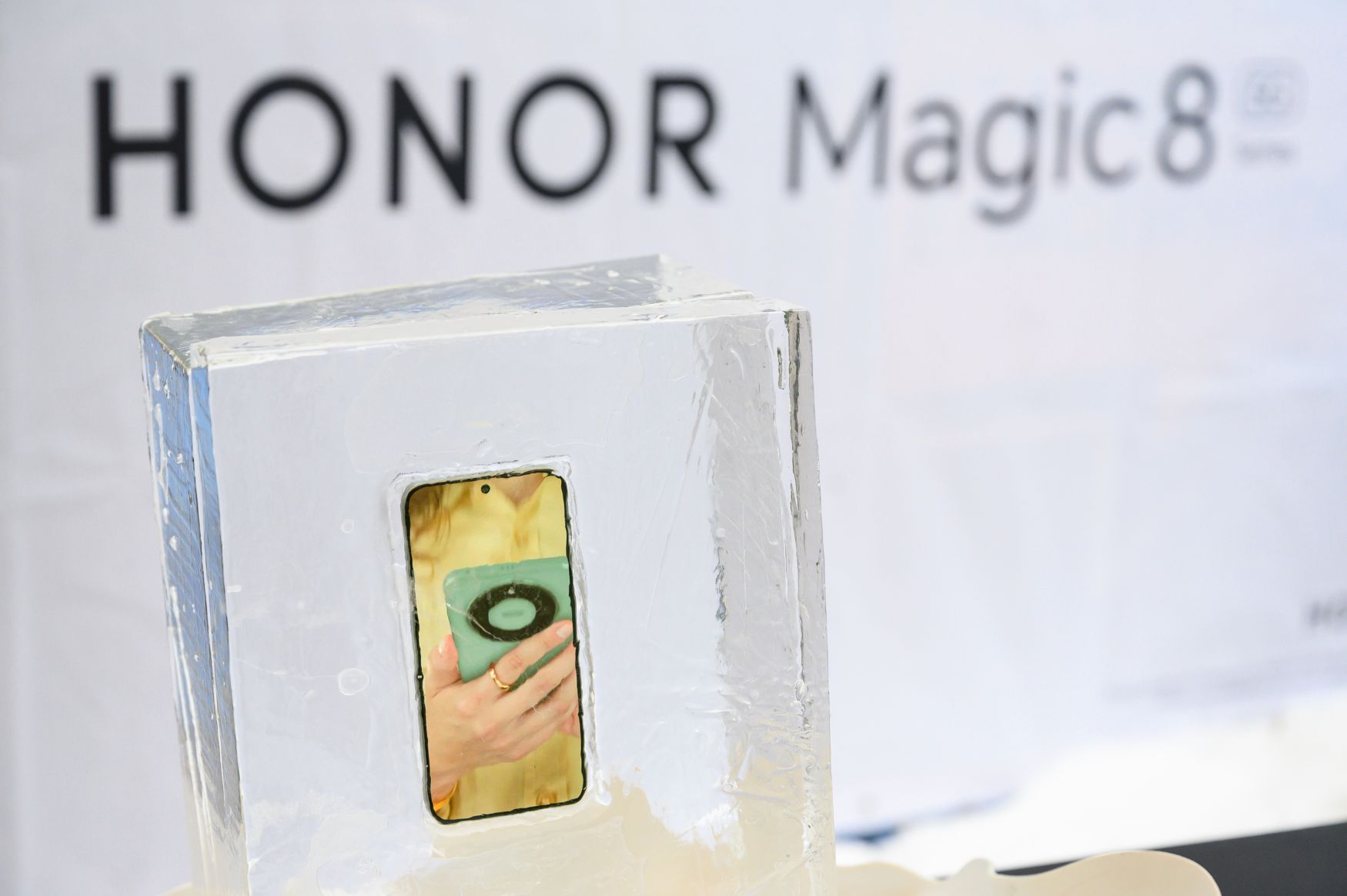 Фокусът на събитието бе поставен върху „неразрушимия“ дисплей и подсилената конструкция на Magic8 Lite. Смартфонът не просто „присъства“ на леда – той бе хвърлян върху твърдата повърхност, замразяван в леден блок и използван от журналисти като инструмент за забиване на пирони в дървена плоскост.