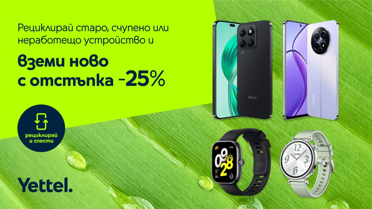 Промоцията важи във всички магазини на Yettel, а за онлайн покупките е достатъчно да бъде въведен промокодът „RECYCLE25“ при финализиране на поръчката, като за трансакции в онлайн магазина, отстъпката се прилага само при плащане в брой. Услугата предлага изключителна гъвкавост – старото устройство може да бъде върнато в офис на Yettel, а при сделка от разстояние – чрез куриер при доставка на новия продукт, което прави процеса удобен и бърз. С намаление през този месец са два смартфона и два часовника: