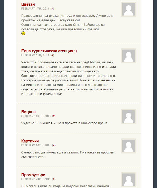 Разгледайте сами коментарите от времето, когато още не ми бе писнало от общуването с вицове и агенции. Много похвали, малко дискусия. Понякога почти никаква.