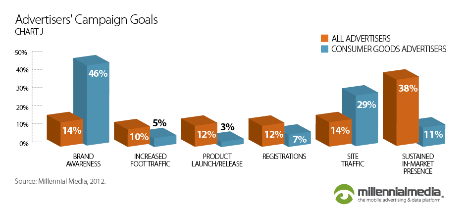 Най-често налаганите цели за мобилни рекламни кампании на потребителски стоки са бранд ауеърнес (46 процента), повишаване на посещаемостта на сайтовете (29 процента) и пълноценно бренд присъствие на пазара (11 процента) – показва новия доклад на платформата Millennial Media за изминалата 2012 година.