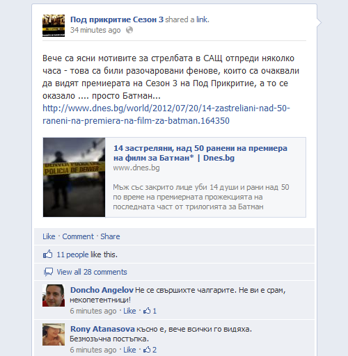 Администраторите на неофициална страница на „Под прикритие“ (трети сезон) разгневиха своите фенове с изключително неходходящ коментар на днешна трагедия от америка, в която 14 души бяха застреляни на излъчване на филма „Батман“.