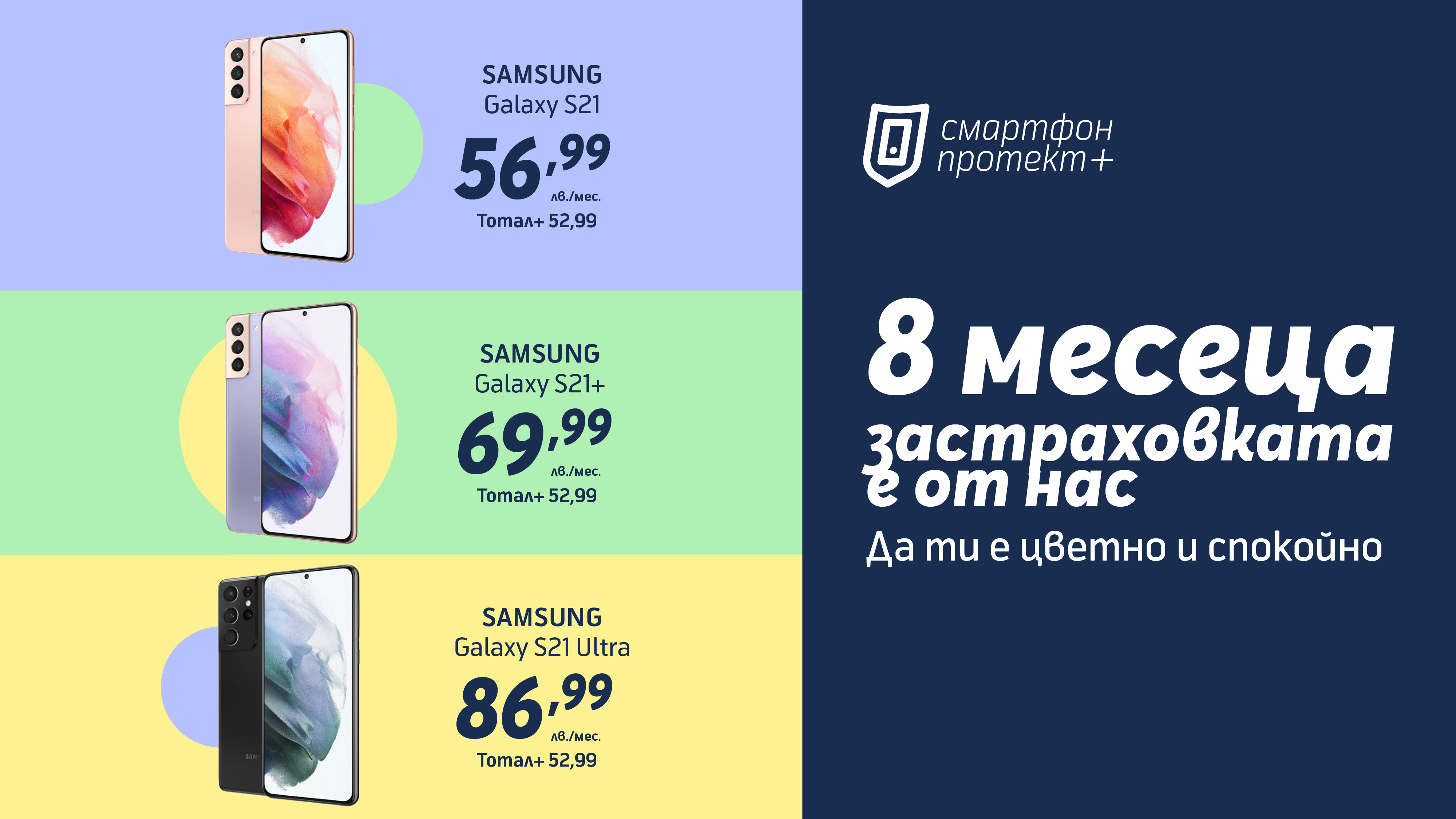 Теленор предлага на своите клиенти моделите Samsung Galaxy S21, S21+ и S21 Ultra с промоционален период от осем месеца за ползване на застраховка на устройството  Смартфон протект+, без заплащане на месечна застрахователна премия от страна на клиента. Кампанията е валидна през целия месец, до 31 март 2021 г. и от нея могат да се възползват всички клиенти на компанията – както частни, така и бизнес.