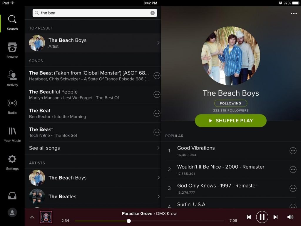 Когато говорим за дизайн, този на Spotify е може би малко остарял. Тъмни тонове, които лесно могат да накарат потребителския интерфейс да изглежда претрупан и неприветлив, въпреки че е доста интуитивен и лесен за използване. На първата страница приложението ви дава достъп до основното – създаване на плейлист, възможност за преминаване към премиум версията, преглед на музиката по песни, албуми, изпълнители и станции, но всичко това е някак си заглушено от тъмните, драматични цветове.