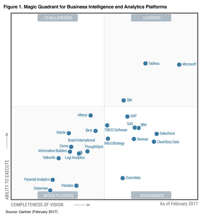 Tableau за седма поредна година е лидер при системите за бизнес анализи (BI – Business Intelligence) в престижната глобална класация Gartner Magic Quadrant. Класацията е напълно безпристрастна и има за цел всяка година да сравни модерните аналитични и BI софтуерни решения на пазара по редица параметри, сред които инфраструктура, подготовка и управление на данните, аналитични възможности, споделяне и вграждане на резултатите от анализите, лекота на работа, цялостен интерфейс и други. Системата Tableau, която се предлага у нас от българската компания за бизнес софтуер Тим ВИЖЪН България, устойчиво заема лидерска позиция в класацията.