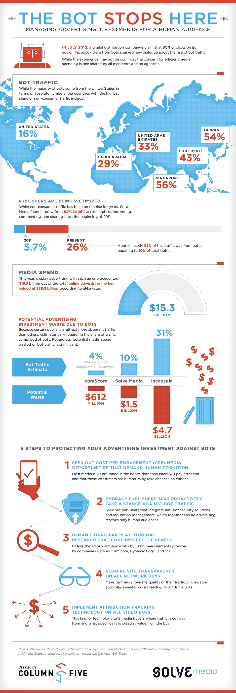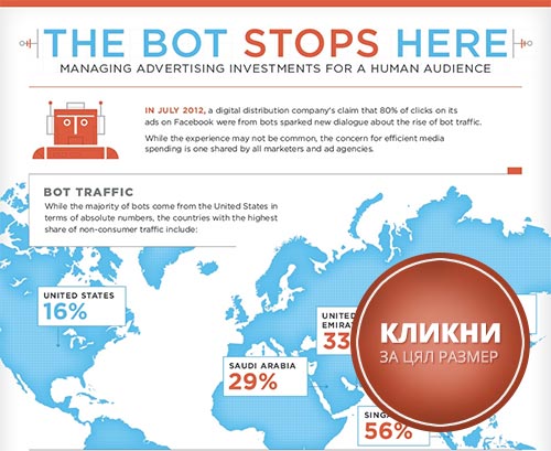 Нова инфографика, създадена от Solve Media, опитва да отговори на тези въпроси с любопитни статистики за количеството посещения от ботове по целия свят.